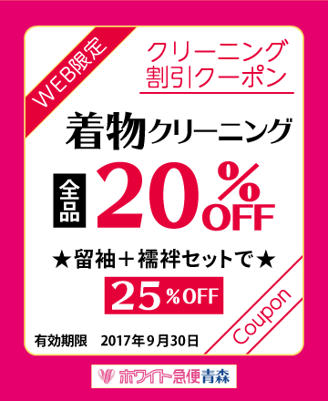 ◆この画面を提示、または印刷してお持ちいただくと、着物のクリーニングが全品20%OFFになります。