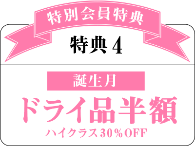 誕生月(1回限り)は、ドライクリーニング料金が何点でも半額、ハイクラス品は30%OFFでご利用いただけます。