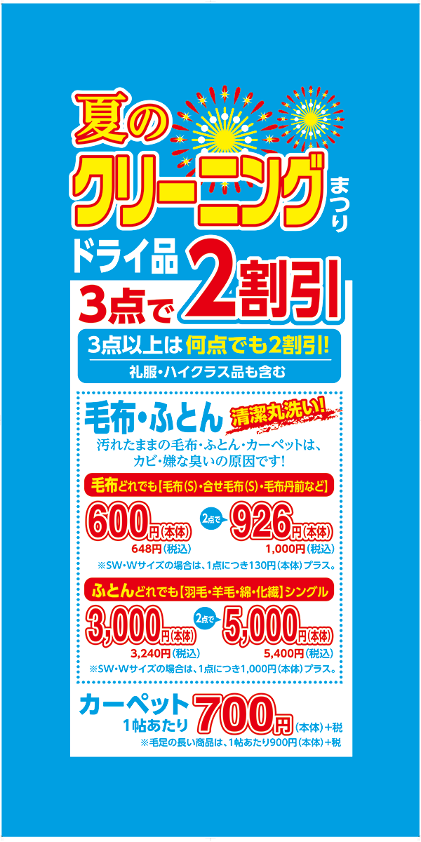 対象商品 ・ズボン・スカート・セーター・カーディガン・ブラウス・シャツ類 ・上着類(背広・スーツ)・学生服(男女)・ブレザー・ヒダスカート ・オーバー・コート類など青森県内全店で開催中!!ぜひこの機会にご利用ください。