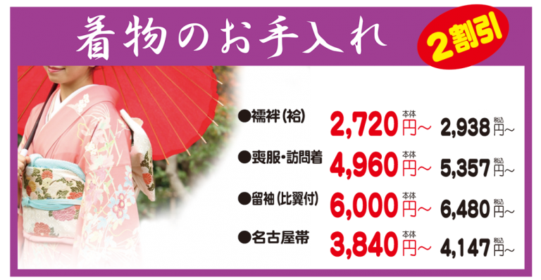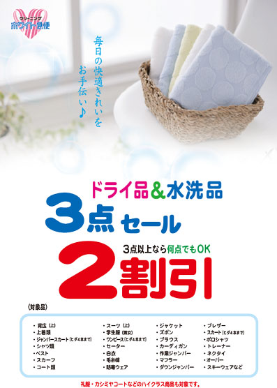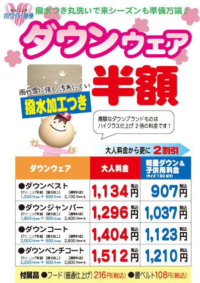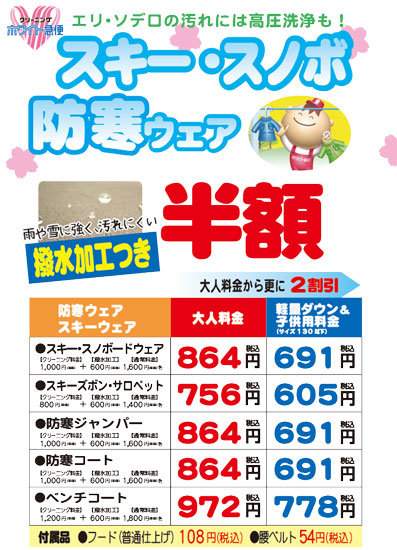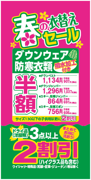 ダウンベスト   通常料金2,268円のところ半額の1,134円!!子供料金907円 ダウンジャンパー 通常料金2,592円のところ半額の1,296円!!子供料金1,037円 スキー・防寒ジャンパー 通常料金1,728円のところ半額の864円!!子供料金691円 スキー・防寒ズボン   通常料金1,512円のところ半額の756円!!子供料金605円 ※すべて税込み価格。 対象商品 ・ズボン・スカート・セーター・カーディガン・ブラウス・シャツ類 ・上着類(背広・スーツ)・学生服(男女)・ブレザー・ヒダスカート ・オーバー・コート類など